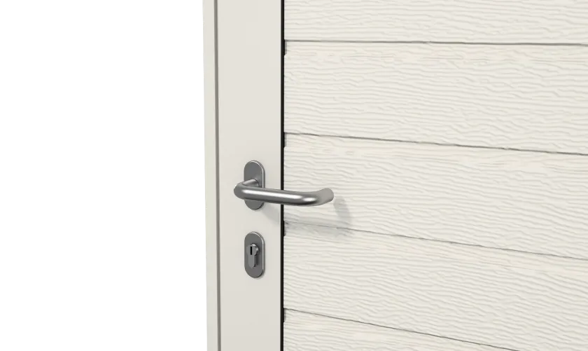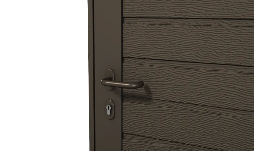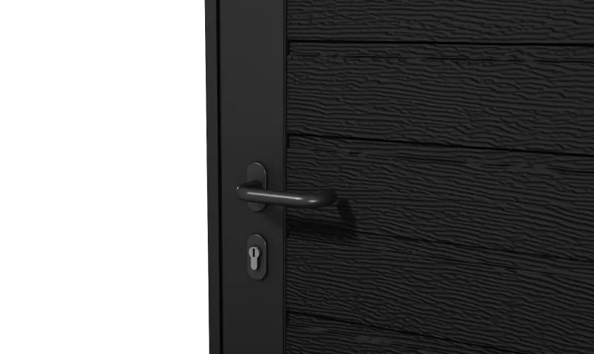 Боковые двери изготавливаются из тех же панелей, что и ворота. Благодаря этому они гармонично сочетаются между собой, а фасад гаража приобретает завершенный вид.